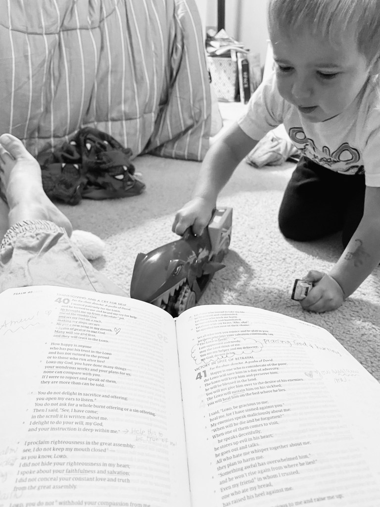 This sounds beautiful, but what does this practically look like? In this season, the to-do list jumps off the page and into my mind, before I even have a minute to register the sound of the alarm. On these mornings, it takes everything in me to walk downstairs and open my Bible. And sometimes, I don’t even make it downstairs, but instead find a cozy spot in my early-riser son’s room while trucks zoom over the pages of my Bible. However it looks, and even if just one word, I feel the nourishment of God’s word filling my soul. In these moments, I know God is my true portion. And all of the other “needs” of the day fall away. The to-do list is still there, but instead of thinking the completion of these items will provide contentment, I know God is all I need.